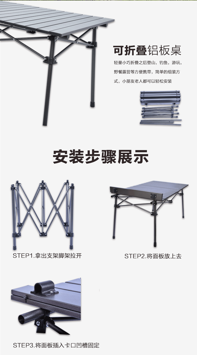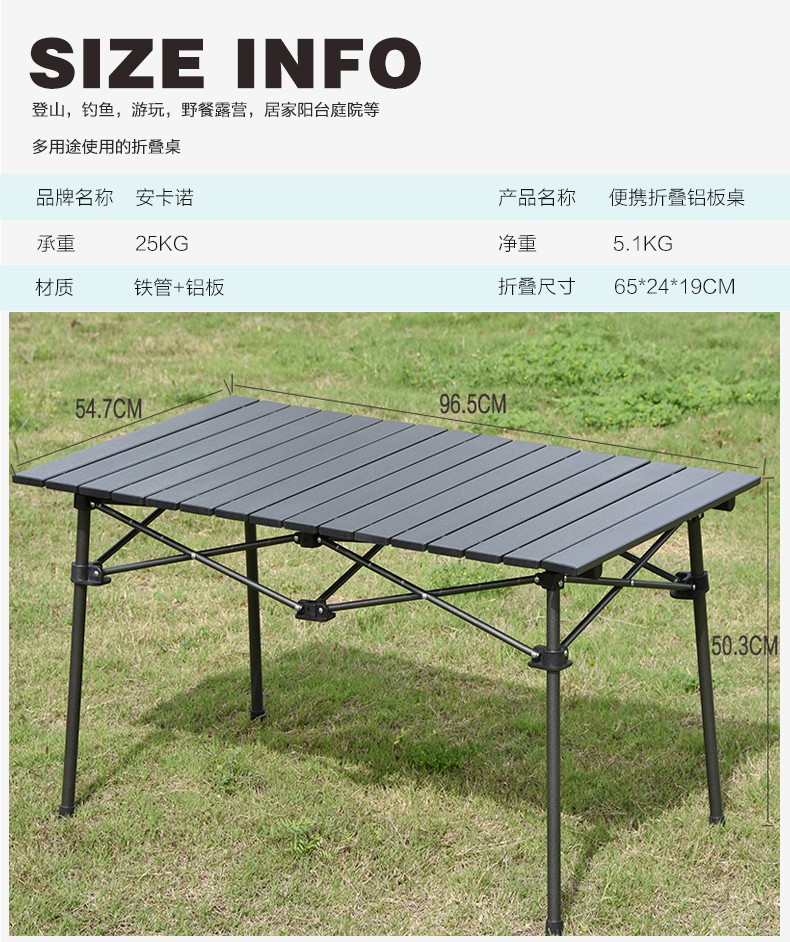 伸缩折叠桌分腿调节户外露营蛋 卷桌便捷铝合金。铝合金材质实用性更强,收纳携带的便携性要高出不少,市面上大部分的蛋卷桌都是铝合金材质的,可选择的尺寸范围也更多,大家更容易买到合适的。内附铝板夹层,大大提升了桌子的平稳性和耐用性。6061铝合金支架轻盈坚韧,同时还有出色的防腐蚀性能。针对野外不平地面,边角使用高强度的防滑脚垫,桌面稳固不易倒。整体仅重0.85kg,太空铝合金材质,超轻易携带。多支架四角结构,轻松安装,四平八稳,支架处采用铆钉固定,支撑性更出色,承重约25kg,完全可以满足家庭露营需要。桌腿袋防滑塑料套,防滑又耐磨,不伤地板。赠送的收纳袋,可背可提,一袋收纳,轻松出行不占空间。