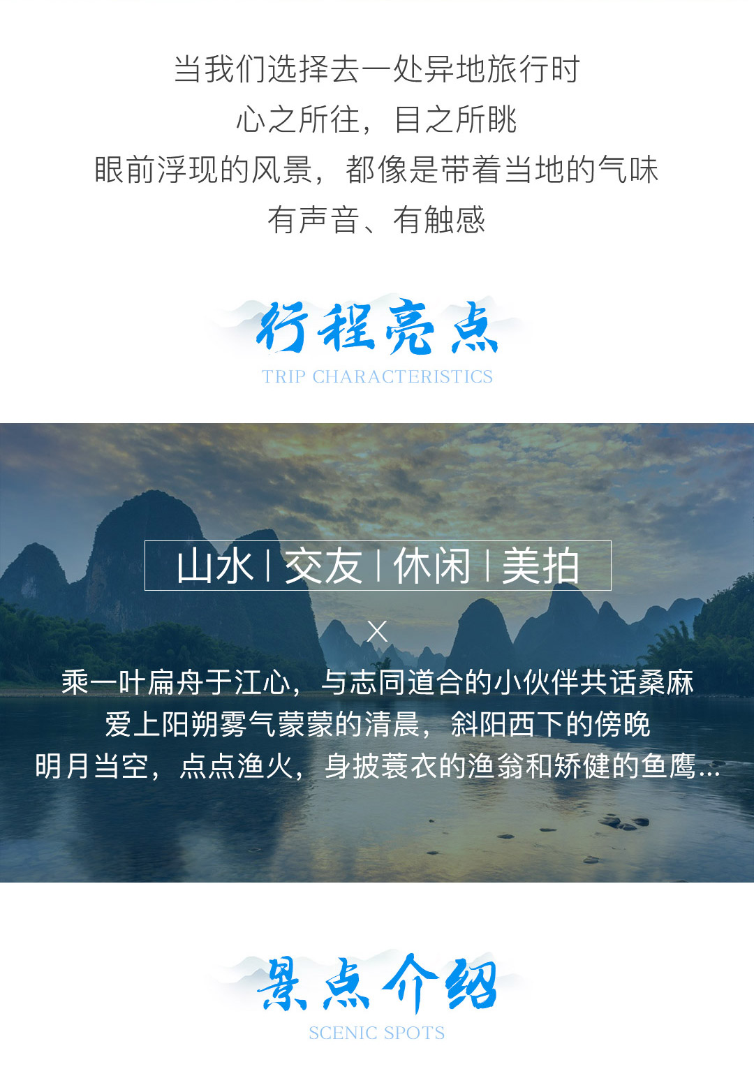 世间太多山水,都是浓墨重彩的壮丽磅礴,于阳朔而言,却独守一份轻描淡写的灵动。 旅行主题:户外旅行主题; 景观亮点:青山绿水,烟波浩渺,渔舟唱晚; 参团客群:中青年户外旅行爱好者; 团队人数:4人起成团,低于4人此团自动解散,所支付费用自动返回原账户; 集合解散:桂林出发,桂林散团; 特别告知:本产品全程纯玩无购物; 支付方式:在线支付+团上现付,详情请查看“费用包含”栏。