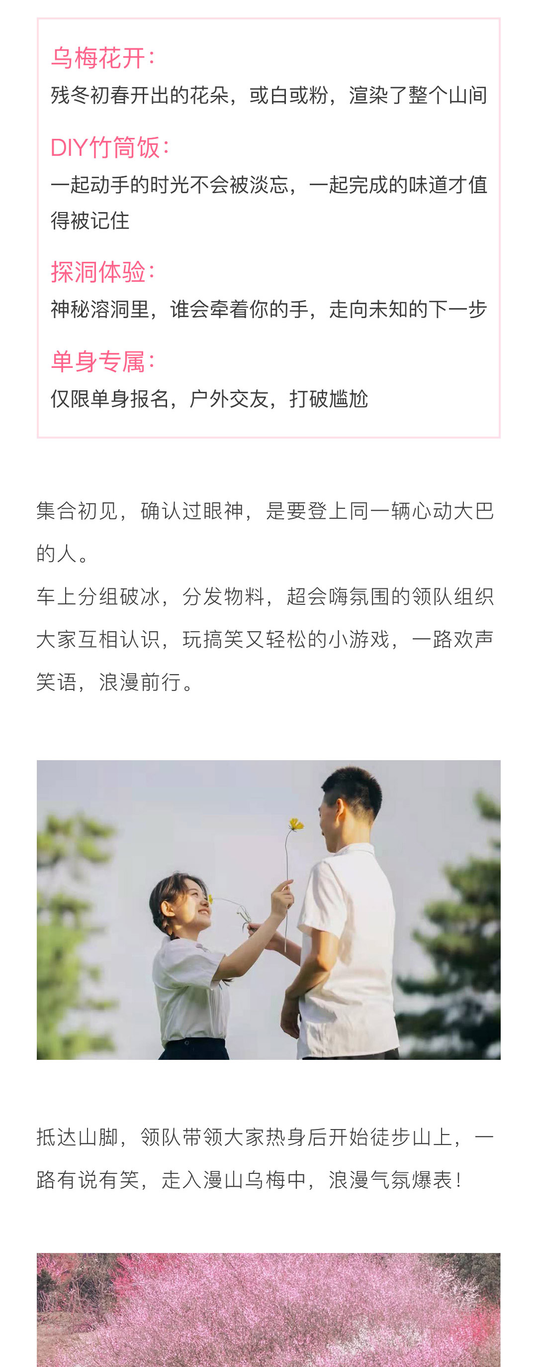 休闲交友,赏花玩乐; 乌梅花开,DIY竹筒饭,神秘溶洞,心动游戏,交友脱单; 精品联谊,邂逅心动,名额有限,先到先得哦! 旅行主题:单身旅行主题; 景观亮点:乌梅花开,神秘溶洞,心动游戏; 参团客群:20-48岁渴望爱情的单身男女; 团队人数:15人起成团,低于15人此团自动解散,所支付费用自动返回原账户; 集合解散:成都出发,成都散团; 特别告知:本产品全程纯玩无购物; 支付方式:在线支付+团上现付,详情请查看“费用包含”栏。