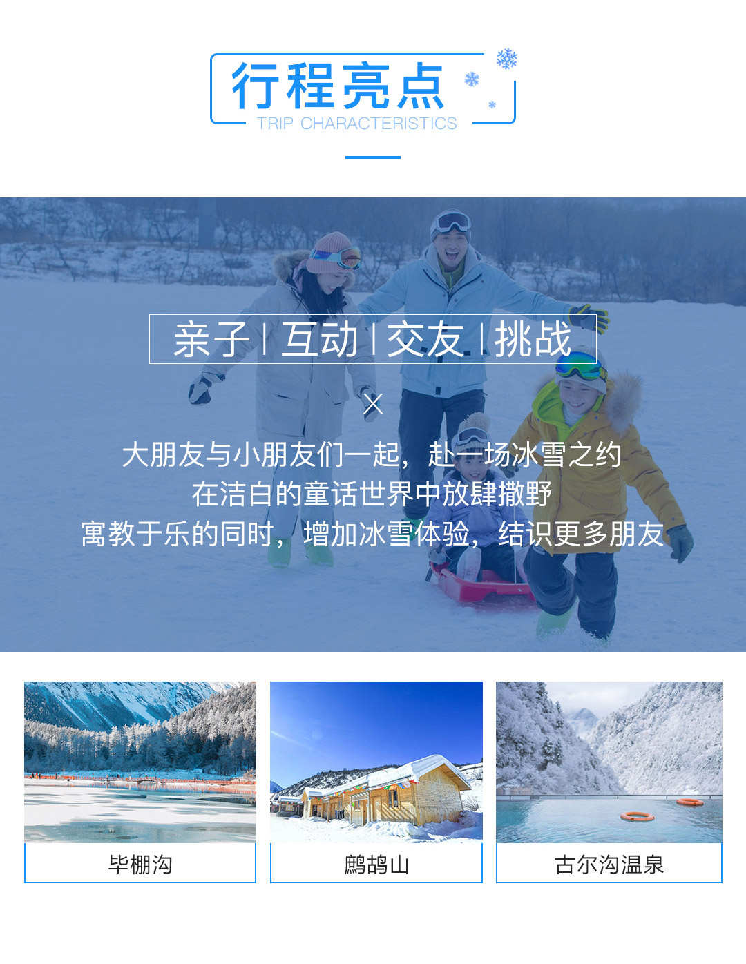 其实旅行,是最能加强家庭凝聚力的活动,与孩子一同旅行出游能带给她的,是不一样的价值观、多样的世界观和多重的人生观! 旅行主题:亲子游主题; 景观亮点:冰雪童话,欢乐滑雪,冬日温泉; 参团客群:4岁以上亲子家庭; 团队人数:16人预约成团,低于16人此团自动解散,所支付费用自动返回原账户; 集合解散:成都出发,成都散团; 特别告知:本产品全程纯玩无购物; 支付方式:在线支付+团上现付,详情请查看“费用包含”栏。
