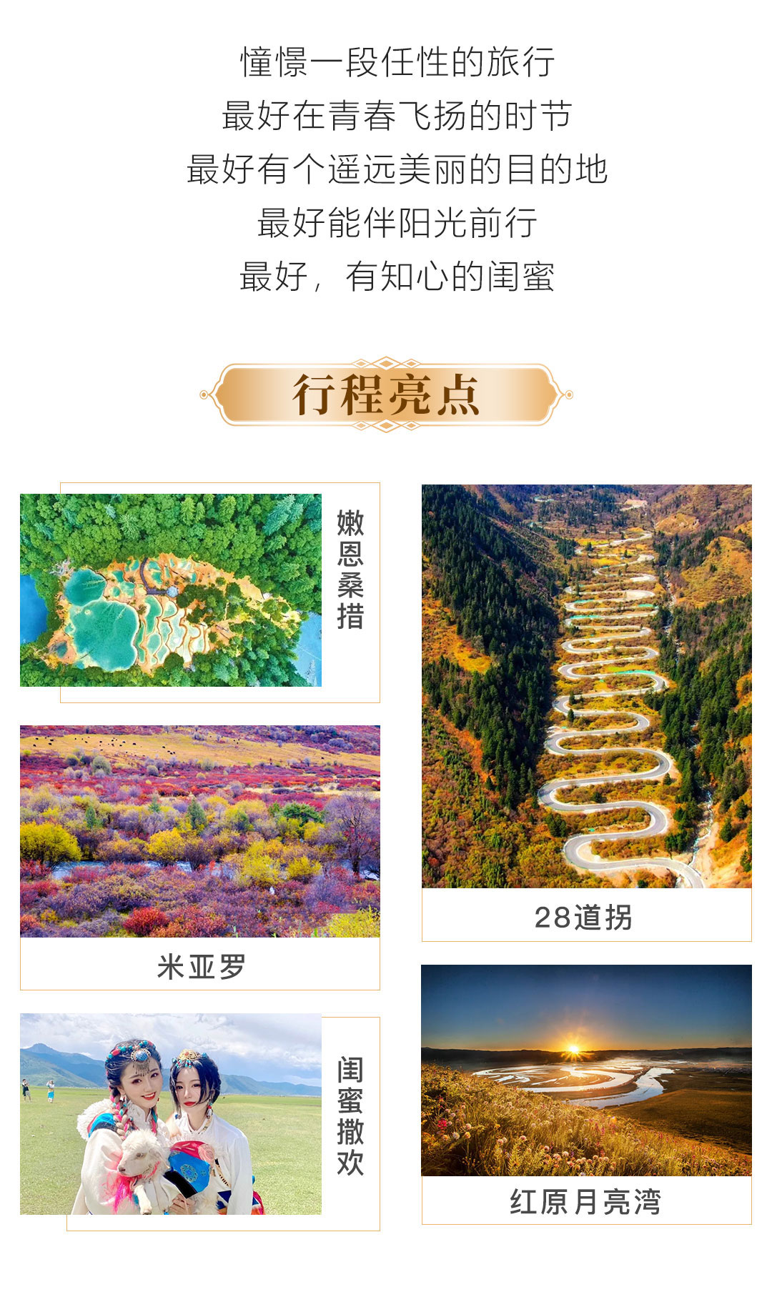 川西又一美景,人少景美,即将惊艳世界! 趁它还没爆火,快和闺蜜们一起来体验承包整个景区的快乐吧! 旅行主题:闺蜜游主题; 景观亮点:绝美彩池,漫山红叶,梦幻草原; 参团客群:中青年旅游爱好者; 团队人数:15人起成团,低于15人此团自动解散,所支付费用自动返回原账户; 集合解散:成都出发,成都散团; 特别告知:本产品全程纯玩无购物; 支付方式:在线支付+团上现付,详情请查看“费用包含”栏。