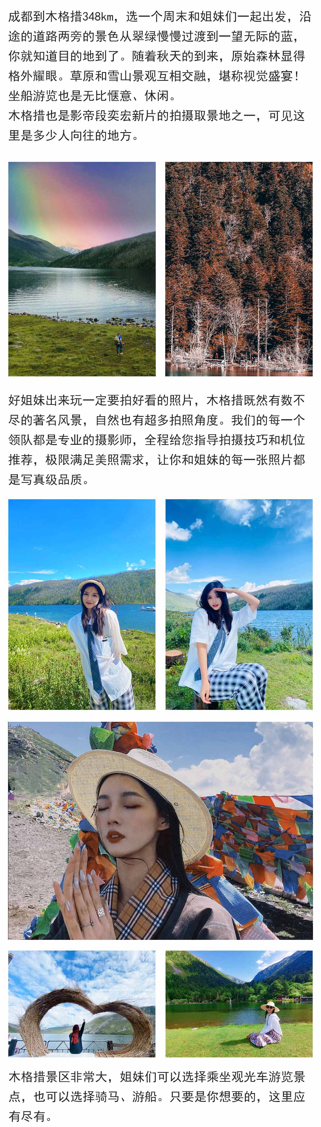 不要赶路,去感受路。放下电脑,收起文件和材料,给小姐妹打个电话,约起来!去看看山、去玩玩水,夜里小酌三两杯。总比宅家里“熬最深的夜,吃最贵的药”来的痛快! 本产品适合18-39岁喜欢户外旅行的闺蜜、小姐姐,12人起成团,若低于12人,则拼团预约不成功,此团自动解散,所支付费用自动返回原账户 [旅行主题]闺蜜旅行,周末休闲 [行程亮点]红海子、木格措、中谷温泉 [集合解散]成都出发,成都散团 [特别告知]真纯玩无购物,请放心旅行 [支付方式]在线支付+团上现付(详情请查看“费用包含”栏)