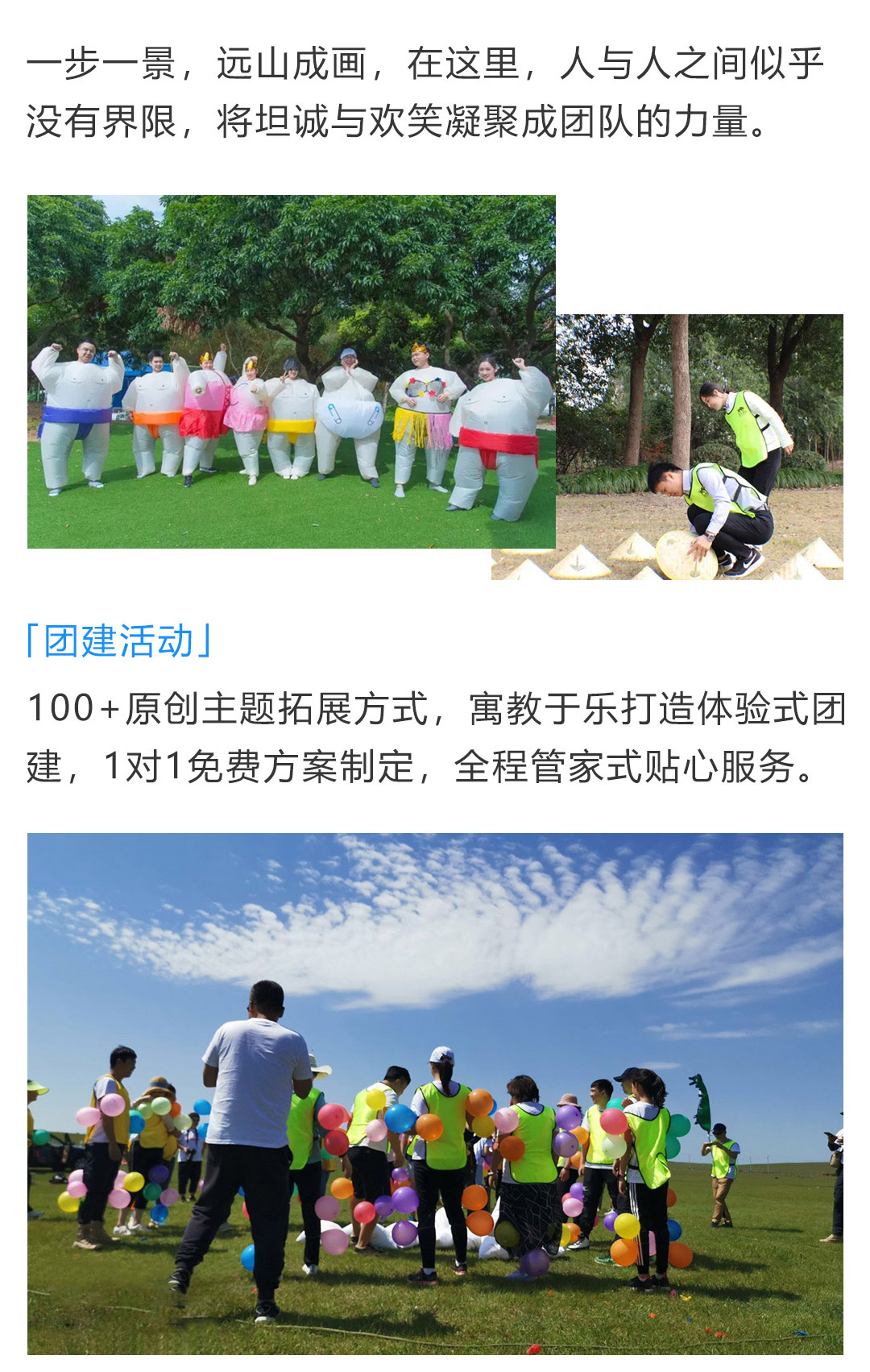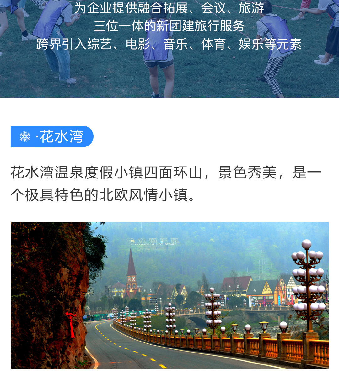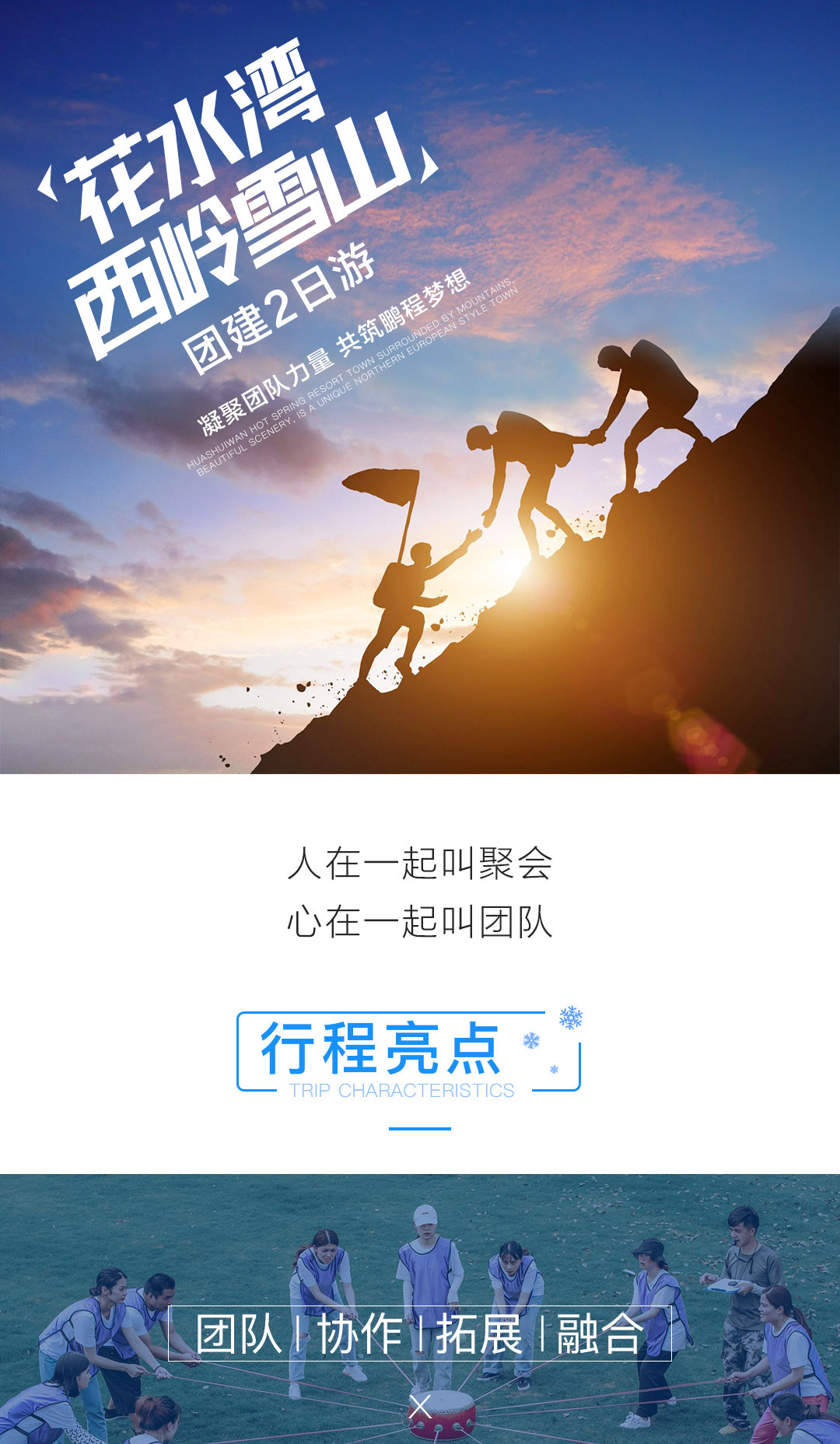 远离城市喧嚣,择一处小镇幽居,赏大雪纷飞,看云卷云舒,这才是团建的最佳目的地。 旅行主题:团建旅行主题; 景观亮点:暖冬温泉,冰雪活动,趣味团建; 参团客群:企业等团队出行; 团队人数:12人起成团,低于12人此团自动解散,所支付费用自动返回原账户; 集合解散:成都出发,成都散团; 特别告知:本产品全程纯玩无购物; 支付方式:在线支付+团上现付,详情请查看“费用包含”栏。