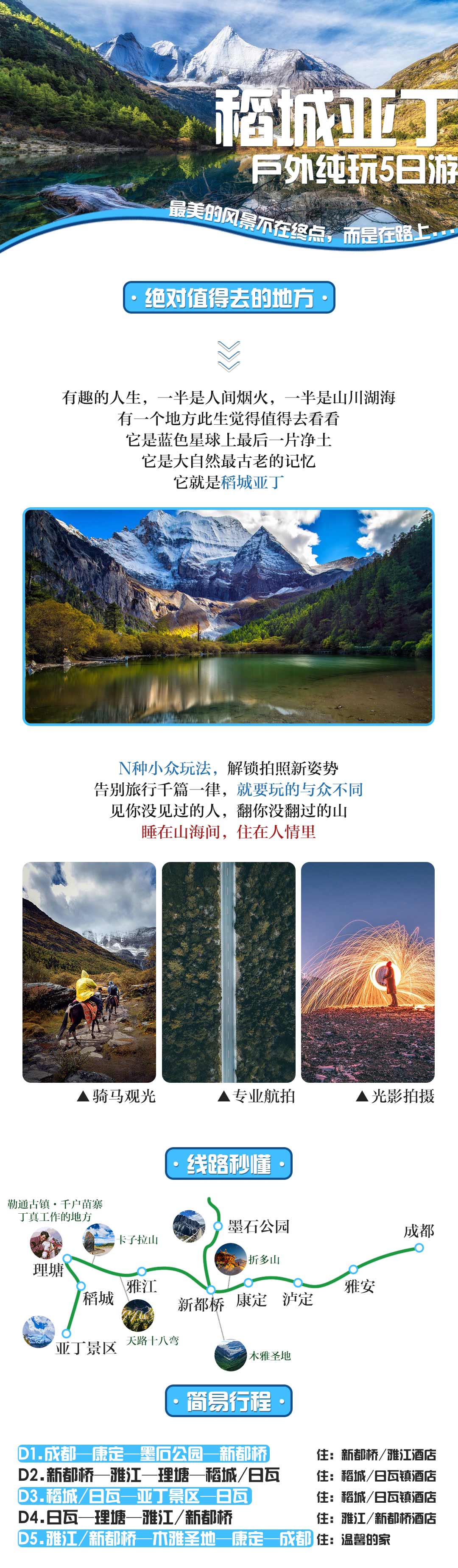 你可能到过新疆、去过西藏、感受过青海的美景,但还有一个地方,绝对值得你亲眼看看——稻城亚丁。 人生不如意十有八九,却还有星河可寄望,还有山川可浪漫,时光从不等人,来一场说走就走的旅行! 旅行主题:户外徒步主题,休闲度假,网红地打卡 行程亮点:高原冰川、雪山,原始彩林,野生海子、草甸 参团客群:18-49岁中青年人群,拒绝60岁以上老年人参团 团队人数:15人起成团(若低于15人,预约不成功,此团自动解散,在线支付费用自动返回原账户) 集合解散:成都集合,成都散团 特别告知:真纯玩无购物,请开心放心舒心旅行游玩 付款方式:线上付款+团上现付(详情请查看下方“费用包含”栏)