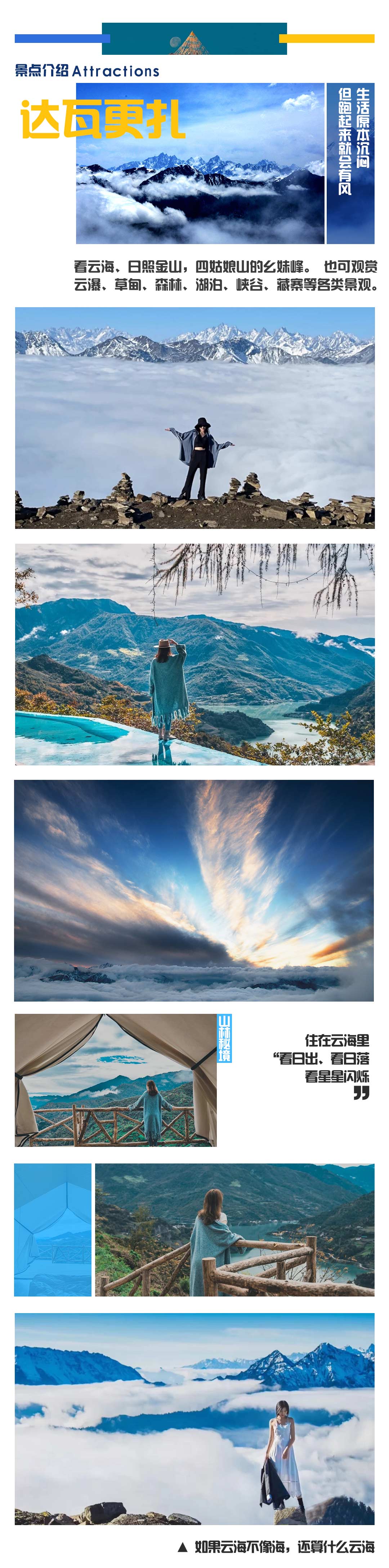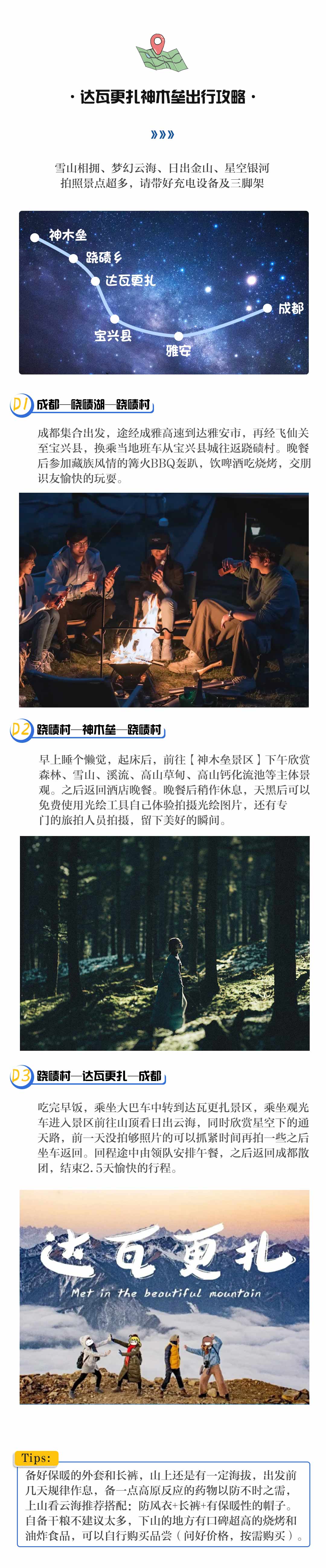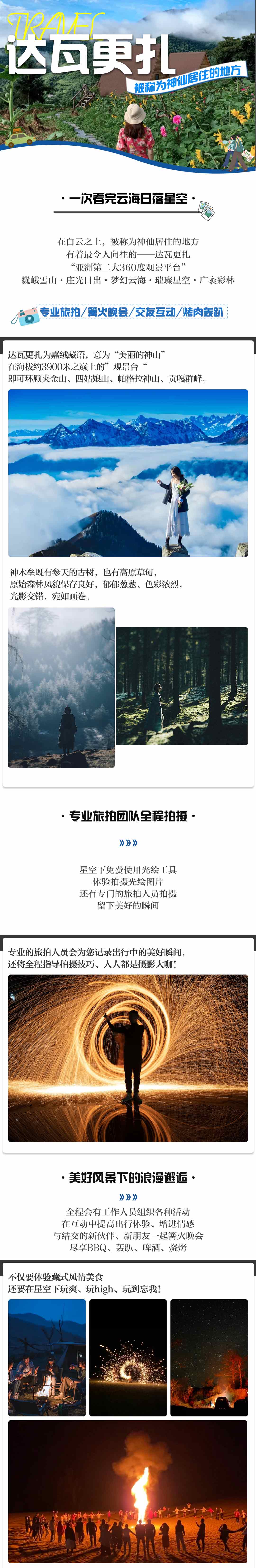 高山是你,云海是你,漫天星河还是你。在白云之上,有一个被称为神仙居住的地方——达瓦更扎 它是“亚洲第二大360度观景平台” 本产品适合20-40岁喜欢户外的单身旅行爱好者 1、旅行主题:户外交友,摄影拍照 2、行程亮点:专业旅拍、烧烤轰趴、互动游戏、看日出云海、森林草甸 3、成团人数:12人起成团,若低于12人,则在线拼团预约不成功,此团自动解散,所支付费用自动返回原账户; 4、集合解散:成都集合,成都散团 5、特别告知:真纯玩无购物,请开心放心舒心旅行。 6、支付方式:在线支付+团上现付 (详情请查看“费用包含”栏)
