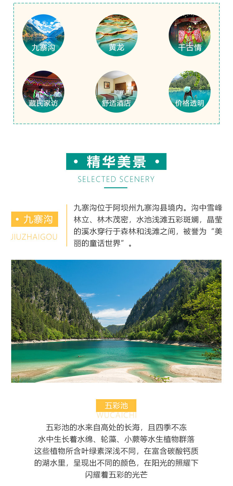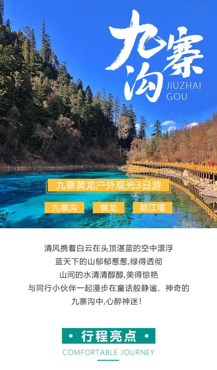 九寨沟黄龙户外观光3日游 畅游童话世界 漫步人间瑶池.那片宁静得能够听见心跳的净土,融入了春夏秋冬的美景,让人心驰神往。 仙境般的童话世界,静待你来~旅行主题:户外观光交友主题旅行,适合中青年户外旅行爱好者; 产品亮点:雪山海子,彩林瀑布,森林峡谷,藏羌风情 团队人数:15人起成团,低于15人则拼团预约不成功,此团自动解散,所支付费用自动返回原账户; 集合解散:成都出发,成都散团; 特别告知:真纯玩无购物; 支付方式:在线支付+团上现付,请查看产品详情页“费用包含”栏。